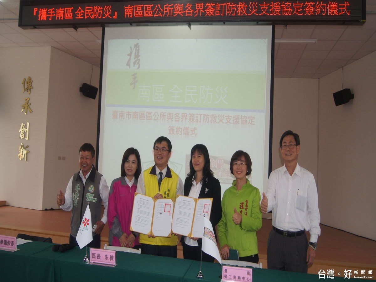 為因應人為或天然等因素造成之大規模災害,規模超過自有能力或資源時,能迅速應變,有效整合資源,提昇應變效能,臺南市南區區公所22日與民間救難團體、旅宿業、通訊傳播團體,簽訂防救災支援協定,期能防止災害擴大,減低生命財產損失。