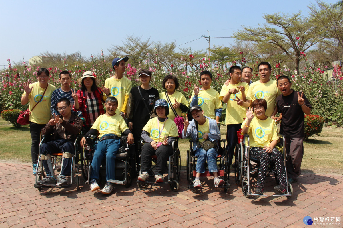 台南市腦性麻痺之友協會成員到學甲蜀葵花快樂賞花,強調是一趟難忘之旅。(記者邱仁武攝)