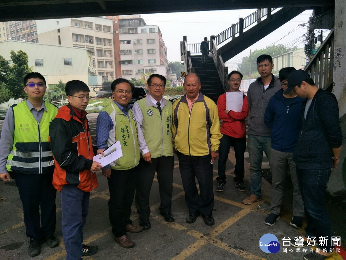 台南永康中華路912巷陸橋下人車爭道險象環生,市議員蔡旺詮接獲民眾陳情,13日偕同服務處秘書長林志文、當地里長周三貴、交通局官員、區公所、台鐵大橋站人員與警方現場會勘,建議於陸橋兩處人行步道出口中間加強警示裝置,出口的石柱加貼反光,人行穿線補強劃新,並取消部份機車格位,讓車輛轉彎有較多空間。