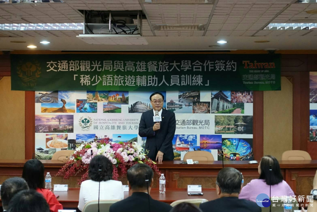 在行政院觀光發展推動委員會林富男委員、高雄市觀光局曾姿雯局長、行政院政務顧問張積光,以及從事新南向觀光業多家旅行社業者、旅行業公協會代表、旅館業公協會代表,還有來自印尼、馬來西亞、越南的學生們共同見證下,交通部觀光局周永暉局長與國立高雄餐旅大學林玥秀校長簽署合作,啟動「稀少語旅遊輔助人員訓練」計畫,將培訓新住民與僑外生成為台灣優質旅遊輔助人員,提升台灣觀光接待服務質量,並創造其就業發展機會,提高對台灣文化的認同,穩固並促進政府推動新南向政策所帶來的成果。