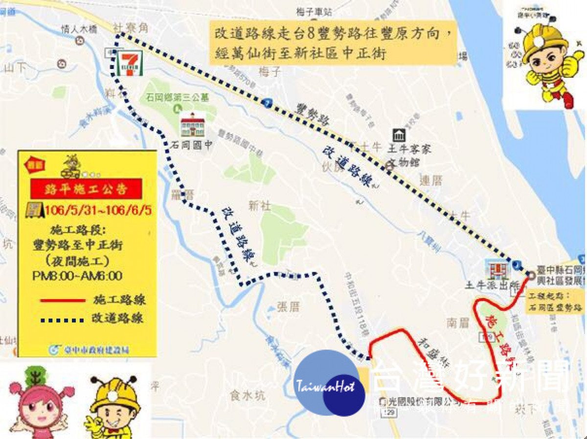 建設局表示,石岡區和盛街位於中129線起點,為石岡新社等區往返臨近區域主要交通動脈之一,但長期通勤公車及大型重車反覆輾壓影響,路面產生疲勞性裂縫、路基龜裂損壞及部分側溝與溝蓋和路面出現落差;為此,市府實施從石岡區豐勢路至新社區中正街2.2公里路平,但因該路段瓦斯老舊管線配合路平期程辦理汰換,故等待路面靜置穩固後,市府將自5月31日起一連6天每晚8時至隔日早上6時封閉道路施工。