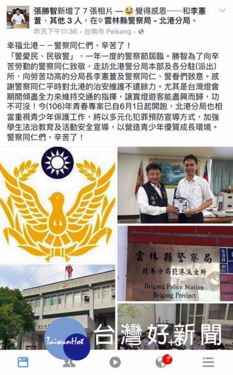 鎮長張勝智在個人臉書粉絲團上發言,「警愛民、民敬警」,藉警察節向辛勞的警務人員致敬,並走訪北港警分局及各分駐(派出)所,感謝由分局長李憲蒼所帶領的警察同仁與眷屬們,尤其是台灣燈會期間傾盡全力來支援交通指揮,讓賞燈遊客能盡興而歸,功不可沒。