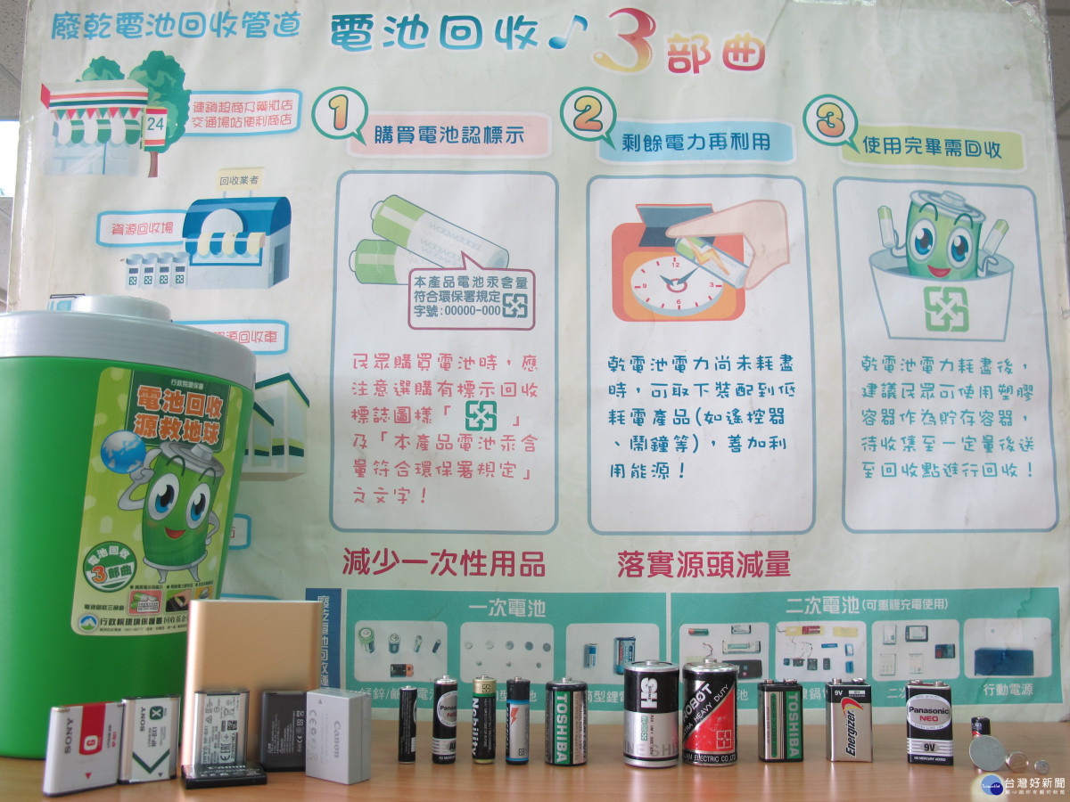 環保局表示,生活中許多用品,包括手錶、手機、電蚊拍、遙控器、手電筒、玩具等需使用乾電池,但因乾電池含有鎘、汞等重金屬,若當成一般垃圾丟棄或隨意棄置於環境中,電解液將滲漏汙染環境,必須妥善回收。