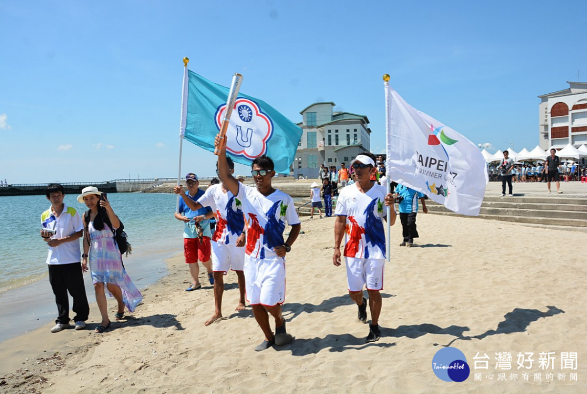2017台北世大運聖火傳遞,今(13)日下午由執行長蘇麗瓊率領台北市聖火隊將火炬交由澎湖縣聖火隊,以陸地路跑與海上風帆船二種形式交錯傳遞聖火,合力完成第1場國內縣市的聖火傳遞任務。