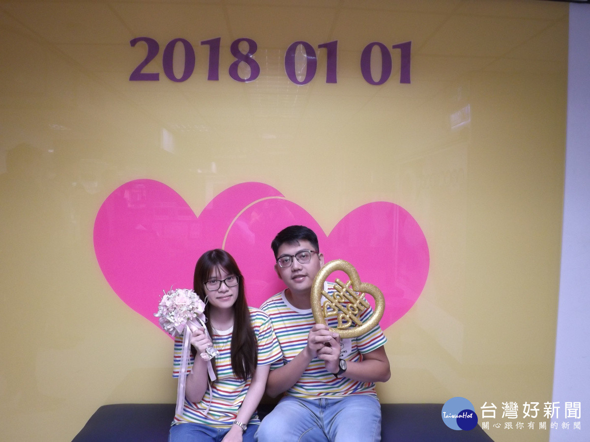 三重戶所新人陳先生說,在超商消費結帳時,就被女店員吸引,主動 搭訕、要電話,還真是奇妙的姻緣。兩人雖然早已辦了婚宴,但特地 選在2018元旦登記結婚,就是要在嶄新的一年延續幸福。