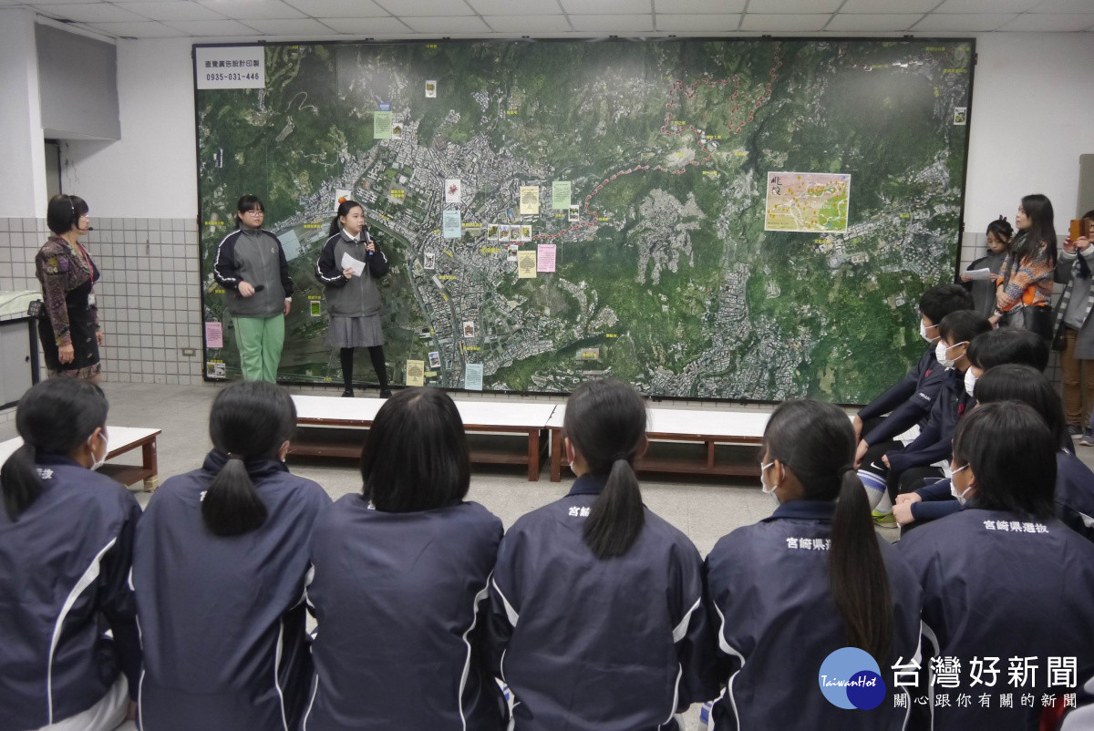 日本宮崎女壘隊參訪,北投國中學生用日語介紹校園。