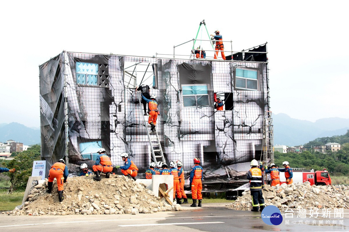 19日下午舉行的實作演練,模擬苗縣遭遇強烈梅雨鋒面及南方水氣移入影響造成災情,豪雨結束後又發生規模6.0地震,演練項目包括社區自主防災整備、災害應變中心開設、疏散撤離、毒性化學工廠搶救、倒塌建築物搶救及收容安置、災後復原等21項。