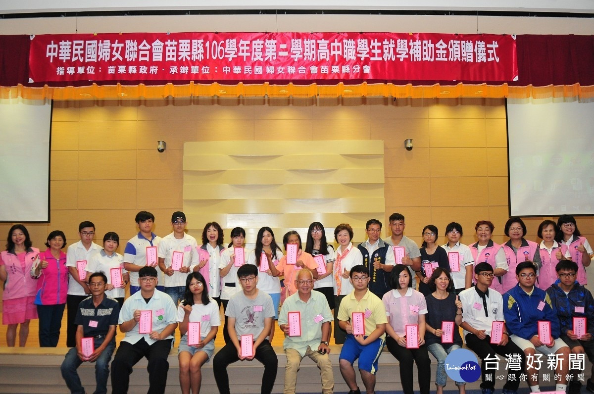 中華民國婦女聯合會苗栗縣分會14日舉行「106學年度第二學期高中職學生就學補助金頒贈儀式」活動,頒發高中職學生就學補助金,共有22位家境清寒學生受惠,主任委員、苗栗縣長夫人蔡麗卿期勉受獎學生認真學習、順利完成學業,日後並能貢獻所學,回饋社會,將溫暖的愛與關懷延續下去。