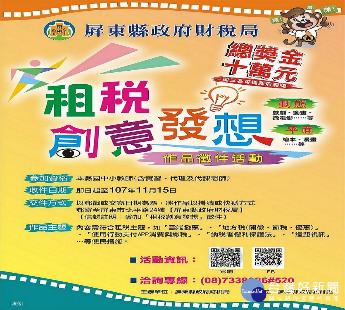 屏東縣政府財稅局舉辦「租稅創意發想」作品徵件活動,自即日起至107年11月15日止,總獎金十萬元,歡迎屏東縣內各國中小教師(含實習、代理及代課教師)個人或組隊參加。