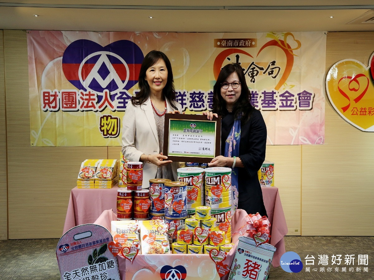 台南市政府社會局為感謝全聯基金會捐贈超過市值138萬元的食品物資給南市實物銀行,5日特由劉淑惠局長代表致贈感謝狀,並由全聯慈善基金會執行長張宜君代表接受,全聯慈善基金會也發給臺南市政府社會局合作夥伴證書,代表二個單位攜手合作、共同散播愛心。