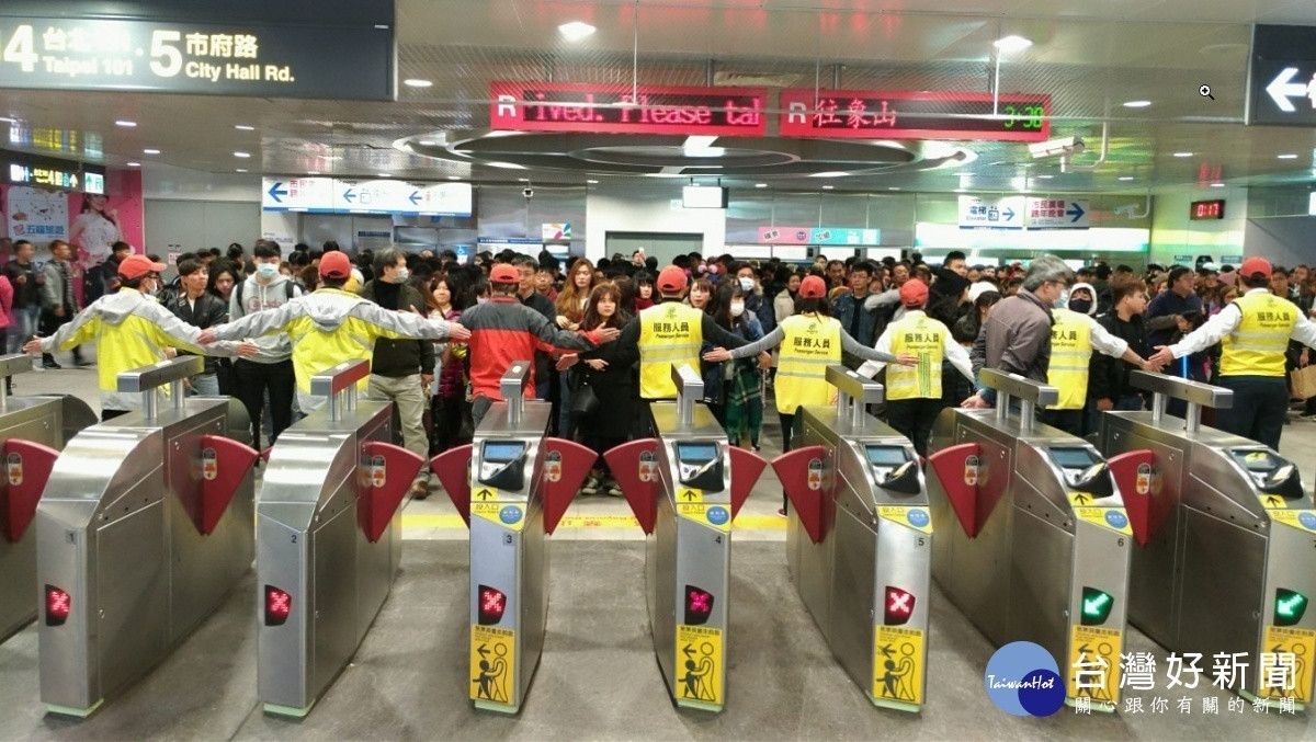 配合臺北市政府跨年晚會活動,臺北捷運公司今年投入約2,500服務人力引導輸運行列,穿著醒目且易辨識的黃色或橘色制服外套,執行旅客引導、月臺警戒、電扶梯管制、車站閘門服務、車站出入口管制、車票販售與維護秩序等相關工作。