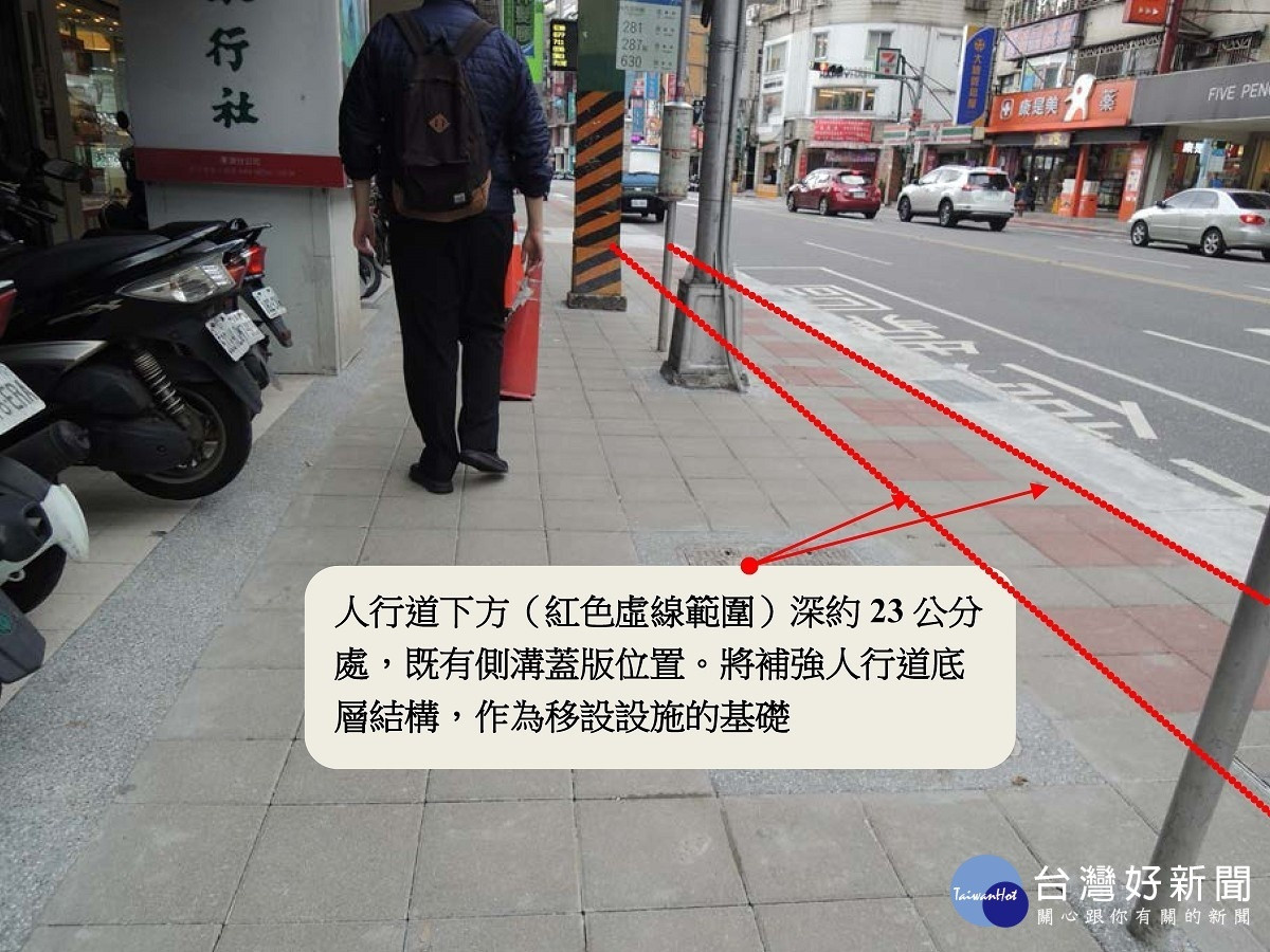 新工處經過檢討後,認為類似拓寬人行道工程,仍應克服困難,協調整合遷移人行道上既有設施,移至拓寬後人行道的設施帶,並研擬人行道底層結構的補強方案,作為移設設施之基礎,提供完善無障障礙的人行環境。