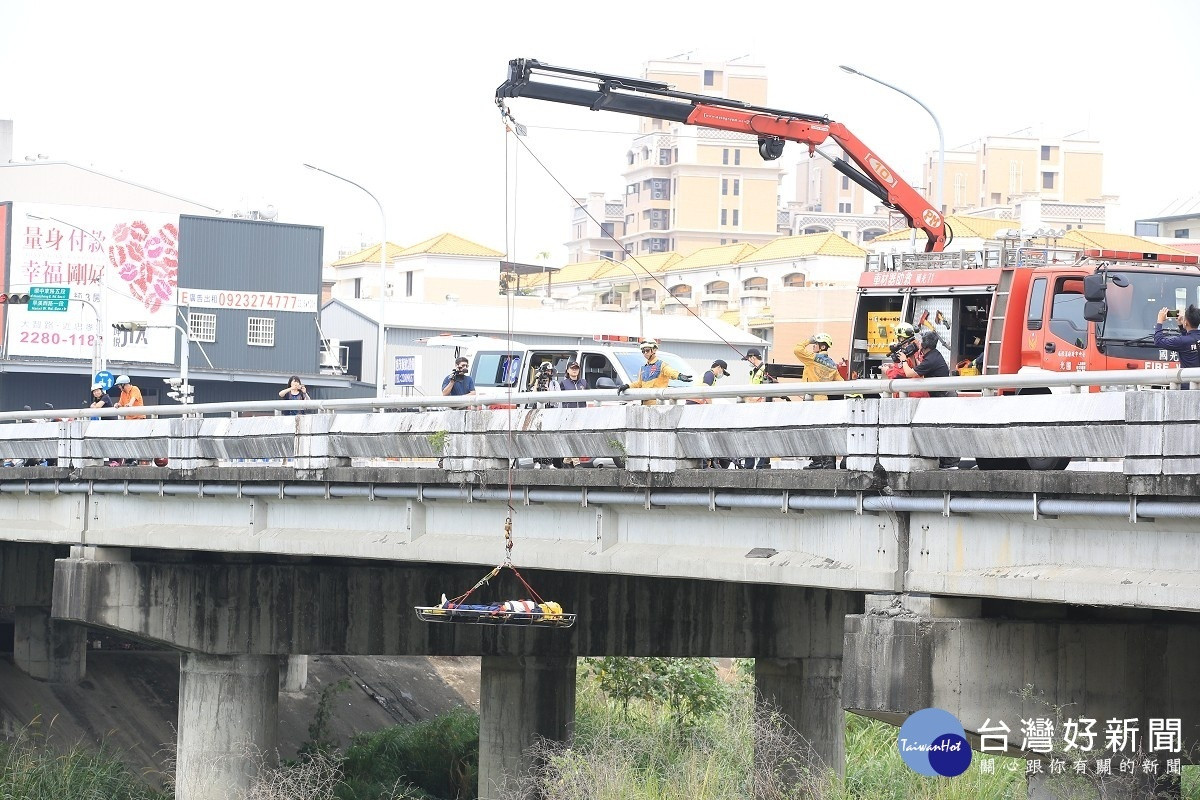 演練內容包括「大面積淹水警報垂直疏散及救溺民眾」項目,由消防局動員吊臂車及籃式擔架演練機車墜落救援,以及前往河床查勘受傷民眾,將傷者吊掛上岸並交由救護車送醫救治情況,透過實況演練強化各執行救災單位熟練操作。