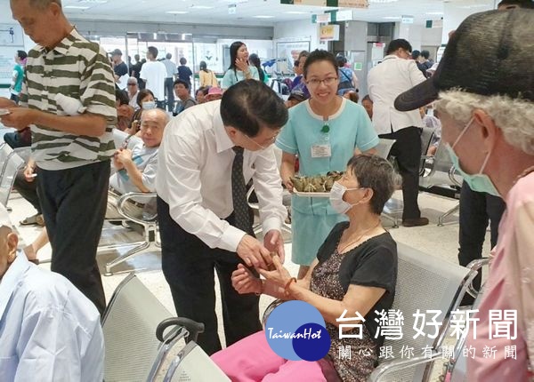 劉厝里社區發展協會包製500個五穀粽,贈送給媽祖醫院看診的鄉親,院長吳錫金等人送上溫馨的關懷,祝福大家端午佳節愉快。(記者陳昭宗拍攝)
