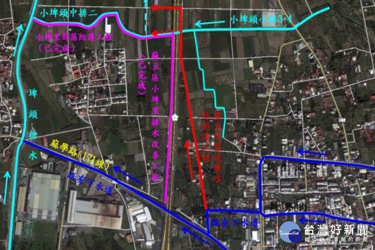 四、麻豆區埤子尾G幹線改善工程,於南49線新設分流雨水下水道225m,經費1900萬元,將南大山腳中排往北分流至麻豆排水,由麻豆區公所辦理中。水利局指出,目前麻豆排水已完成治理12公里,埤頭排水已完成治理3.8公里,包括總爺排水應急工程等,總經費達30億4260萬元。