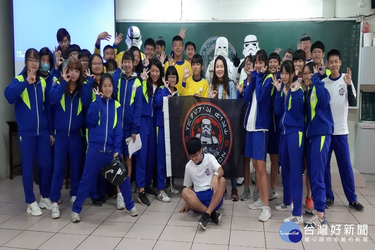 陳佳文老師表示,為了讓學生接觸多元的異國文化,進而增強學習外語興趣,她透過線上申請,由The World in Your Classroom提供老師與國際志工,自英國的舞台工程師可禮安與3名星戰cosplay愛好者,走進教室與學生分享星際大戰角色,也讓學生了解英國文化。