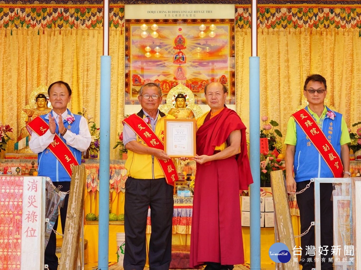 7月18日周末一早,古坑鄉長沈勝騰、鄉公所主秘王秋信、議員顏忠義助理李昕紘、天浩宮地母廟主委黃俊立及雲火火舞團團長李政翰蒞臨佛殿參加祈福法會。沈勝騰鄉長致詞表示:感謝行動佛殿環島祈福行程來到古坑,僅代表全體鄉民誠摯歡迎大家,祝福法會圓滿成功。