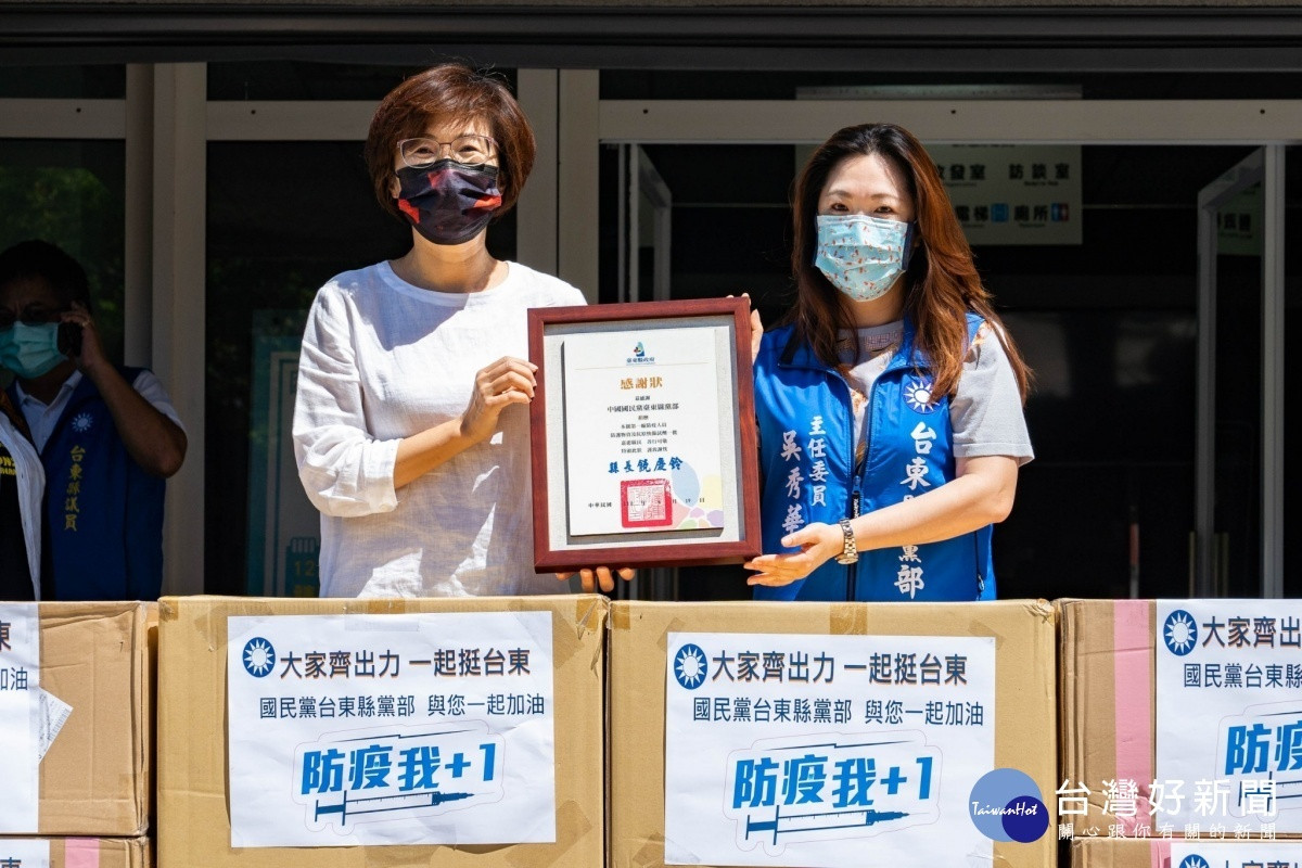 新冠肺炎疫情雖有趨緩,但民眾仍不能鬆懈,尤其處於防疫第一線的醫護、警察、消防及各鄉鎮市公所人員,風險及壓力還是相當大,防疫物資不易採購,為保護第一線防疫人員,各界踴躍捐贈防疫物資,守護同仁執行勤務的安全,提升防疫效能,國民黨臺東縣黨部主任委員吳秀華19日上午偕同臺東縣議會國民黨黨團書記長章正輝、副書記長黃瑞華、高美珠等議員於臺東縣衛生局捐贈包括有防護衣1000件、快篩劑1170個、護目鏡2100個及防護面罩2000個,由縣長饒慶鈴代表接受。