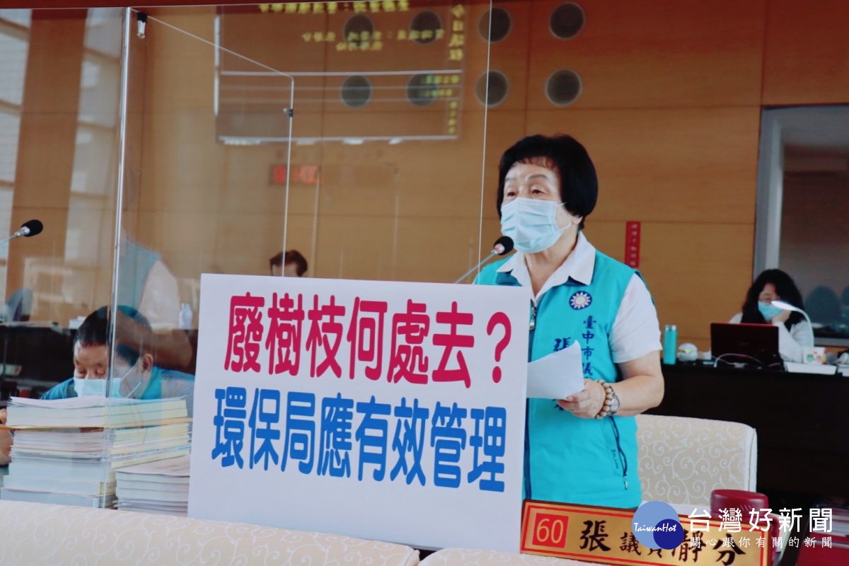 市議員張瀞分也關切廢棄樹枝的去化處理情形,張瀞分說, 根據環保局的統計,台中市每年所回收的廢樹枝、樹幹、樹葉等大約有1萬1800公噸,根據環保局業務工作報告(p. 311),文山綠資材中心去年9月到今年2月底,約半年的時間, 進場處理約1125公噸廢樹枝, 破碎後在台中市廢木料銀行開放民眾、學校、機關及團體領用, 近幾個月來木屑成品去化率達100%。