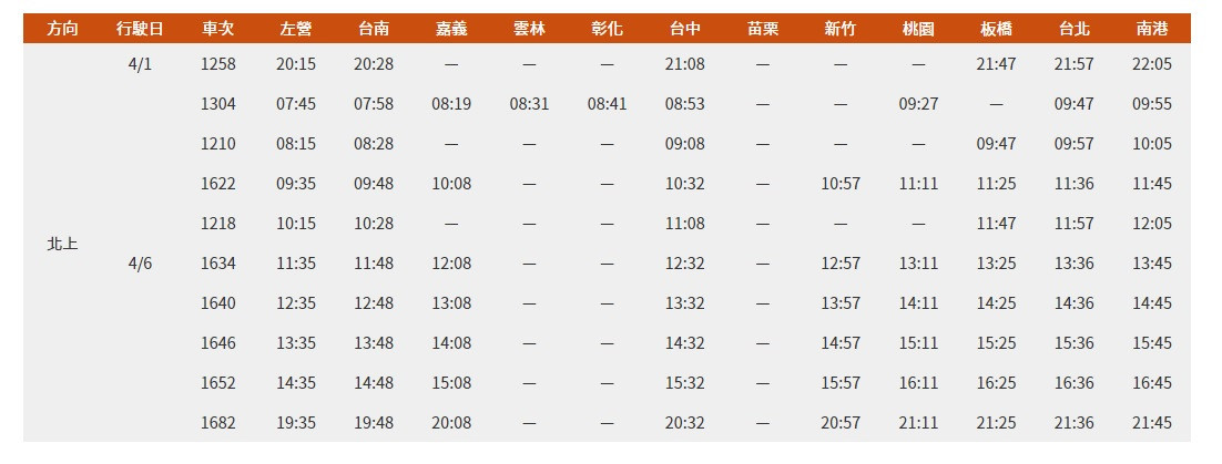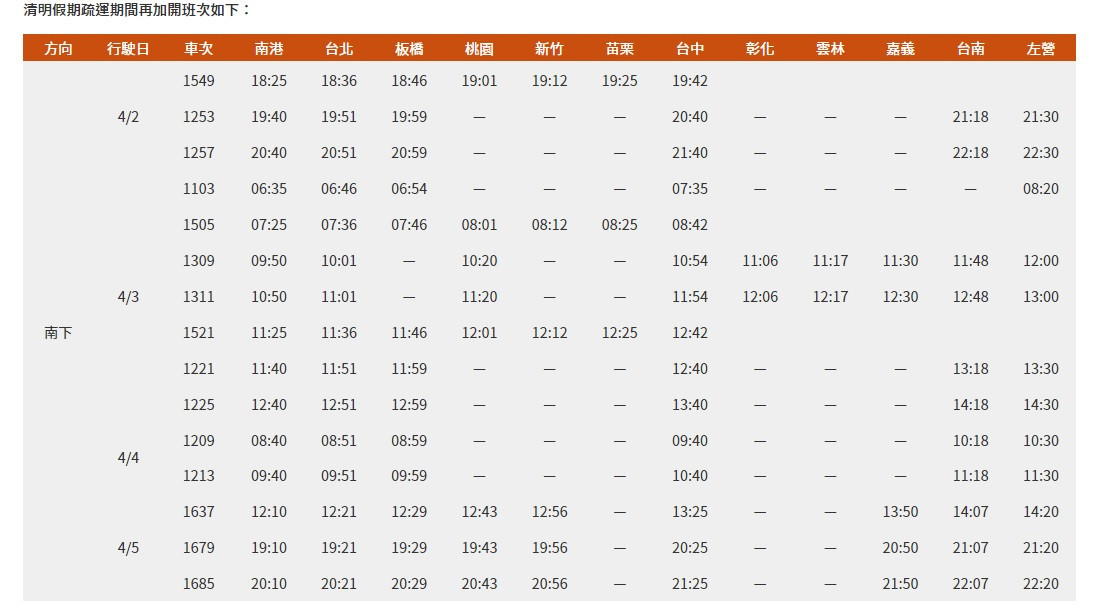 高鐵指出,2022年清明疏運期間共加開158班次列車(南下74班、北上84班),總計6天提供1,026班次列車的旅運服務,以服務旅客清明返鄉掃墓及假期出遊。各車次列車並依旅運需求提供3至5節自由座車廂,以服務連假期間大量旅客。
