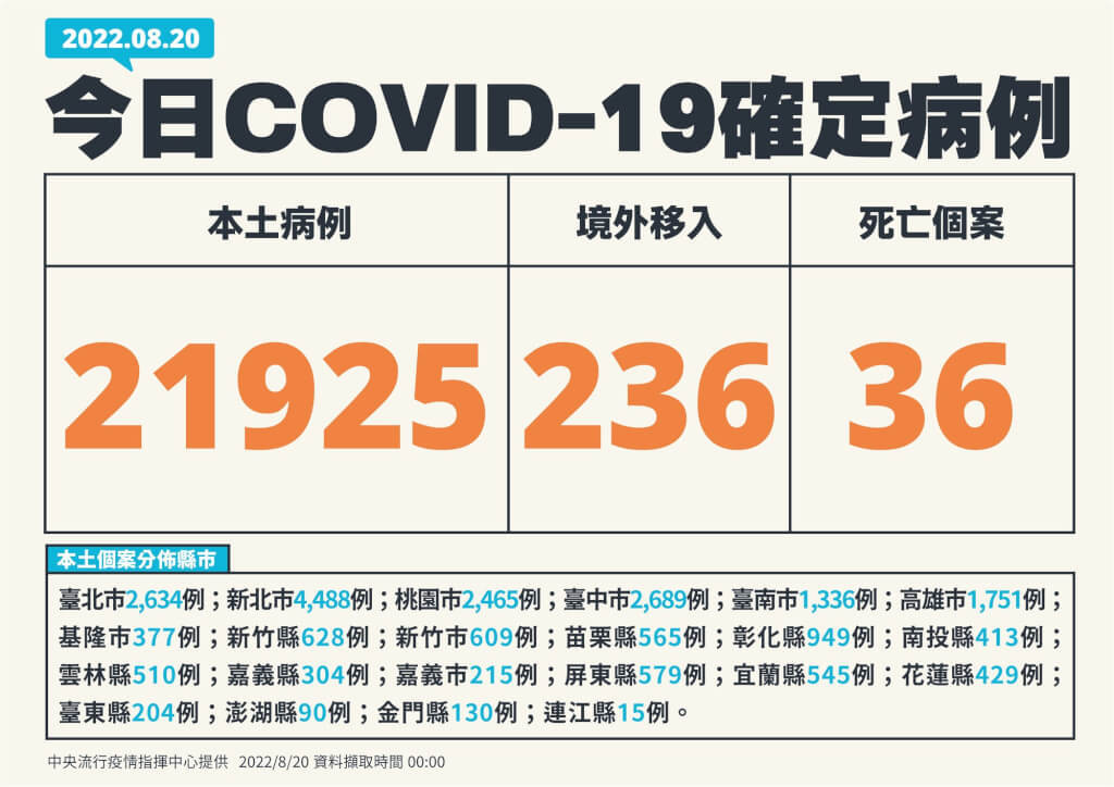 中央流行疫情指揮中心今(20)日公布國內新增22,161例COVID-19確定病例,分別為21,925例本土個案及236例境外移入;另確診個案中新增36例死亡。