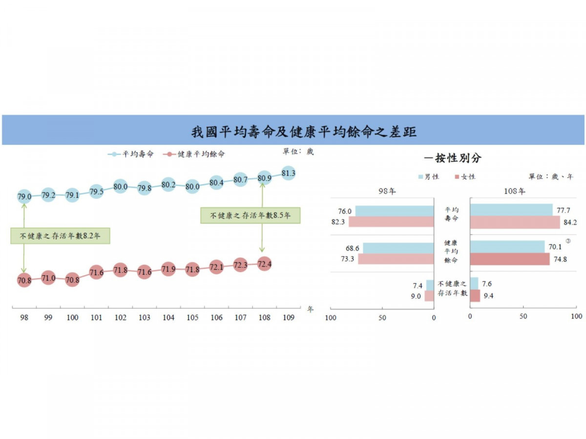 另一方面,依據衛福部統計108年女性不健康之存活年數9.4年高於男性(7.6年)1.8年(見附圖)。近期健保署統計110年失智症就醫人數為29萬6,997人,失智失能照護費用動輒數百萬甚至上千萬,這些數據足以讓高齡者好好思考「晚年希望住在哪裡」,萬一失智失能,如何確保晚年的生活照護模式能夠如自己期望,不會讓子孫陷於照顧離職乃至照顧悲劇的深淵。