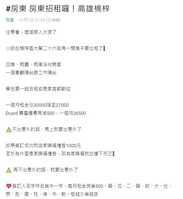 招租文通常就簡單寫清楚類型、樓層、格局、租金等條件而已,不過為了吸引房客入住,不少房東行銷房子的方法越來越有創意。有位在高雄的房東在Dcard貼招租文,表示自己在高雄楠梓有一戶「4房、2廳、2衛浴、1個景觀陽台及工作陽台、汽機車位各1」,不僅水電費依帳單收費,下訂還大方送出禮券,而且只要簽訂人的名字符合他規定的「14字」其中一字,每月都能減免500元租金,此貼文發出後,馬上吸引大批網友的討論。
