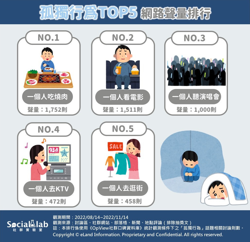 《Social Lab社群實驗室》本次透過《OpView社群口碑資料庫》追蹤三個月網友熱議的「孤獨行為」相關話題,帶您了解最受到網友熱議的5大孤獨行為排行。