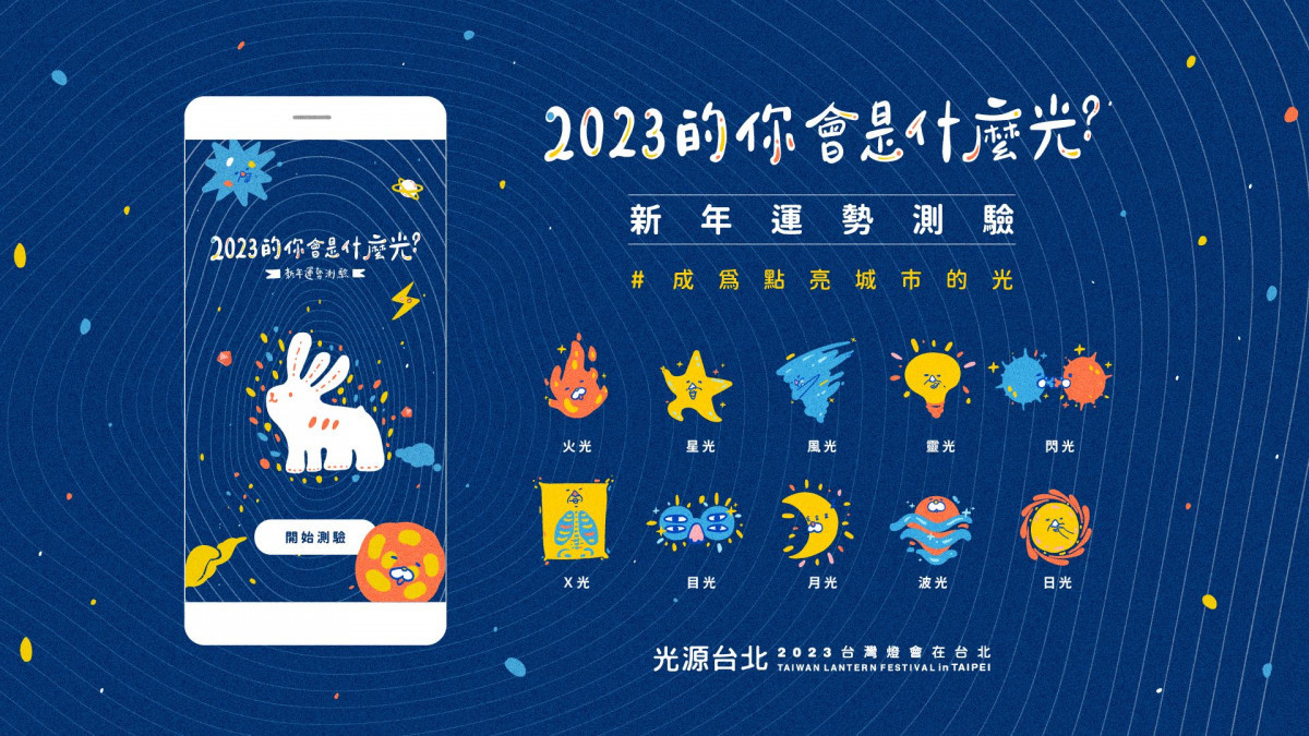 此外,呼應燈會主題「光源台北」,每個人都是城市光點的概念,北市府同步推出有趣的新年運勢測驗,讓民眾測測自己2023年將成為什麼光。透過光源兔的指引,帶領民眾到光源盆地許願,藉由旅行的選擇,測出不同的運勢結果,旅行途中的場景也融合台北市的特色:包含「台北車站」、「捷運列車」、「盆地」等等,運勢結果共有星光、閃光、X光等 10 種答案,其中還有3款「超稀有」結果等著大家來發掘!也希望藉由運勢測驗,祝福大家新的一年好運連連!