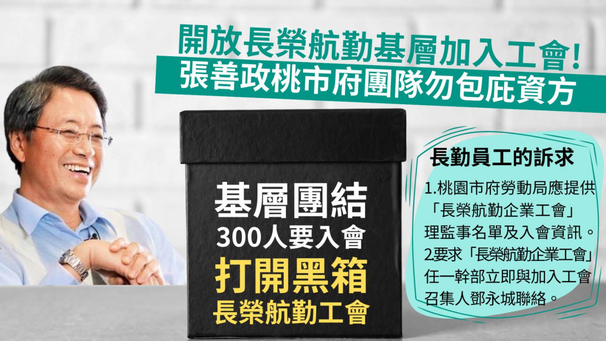 長榮航空企業工會11日發布聲明指出,桃園市政府作為長榮航勤公司和長榮航勤企業工會的主管機關,不應該繼續包庇資方操控工會、妨礙勞工加入工會的行為,該工會強烈呼籲,桃園市長張善政應立即提供「長榮航勤企業工會」完整理、監事名單,並要求「長榮航勤企業工會」任一幹部立即與「加入工會召集人鄧永城」聯絡,讓超過三百位的基層員工依法一起加入工會。