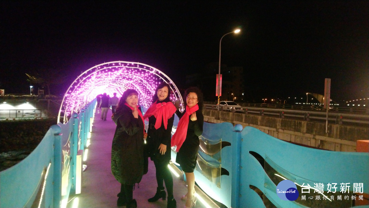 隨後,由葉鄉長帶領所有與會的鄉民代表及村長們共同啟燈,一瞬間,所有花燈都亮了,美極了!葉鄉長隨即帶領所有與會貴賓及民眾走過橫跨水里溪的情人橋,情人橋在燈光點綴下,好夢幻,有民眾說:挺浪漫的,水里也有情人橋啊!