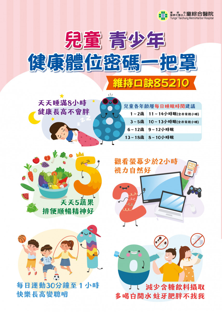 小兒腸胃科胡書瑋醫師表示,兒童或青少年體重過重的人數逐年增加,醫院因應需求而開設了【兒童肥胖防治門診】,希望協助家中有過重兒的家長一起幫孩子重拾健康。童醫院也設計一套維持健康體位的密碼口訣「85210」,8是天天睡滿8小時,健康長高不會胖;5是天天5蔬果,排便順暢精神好;2是觀看螢幕(手機、電腦或電視等3C產品)少於2小時,視力自然好;1是每日運動30分鐘至1小時,快樂長高變聰明;0是減少含糖飲料攝取,多喝白開水,蛀牙肥胖不找我。