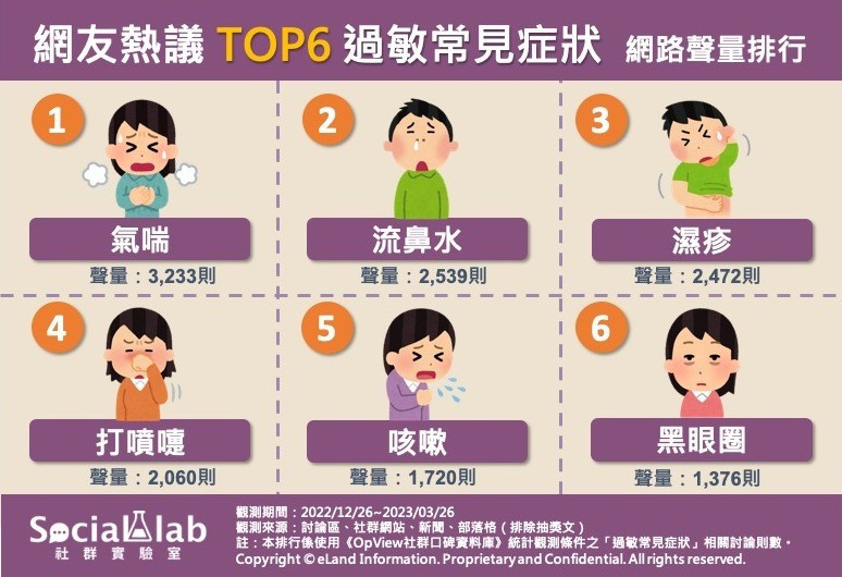 《Social Lab社群實驗室》本次透過《OpView社群口碑資料庫》追蹤近三個月內「過敏常見症狀」相關話題的網路聲量,帶您了解網友熱議的六大過敏常見症狀有哪些。