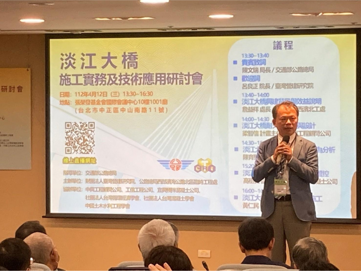 為此,交通部公路總局及財團法人臺灣營建研究院於112年4月12日假張榮發基金會國際會議中心共同舉辦「淡江大橋施工實務及技術應用研討會」,邀集實際參與淡江大橋設計及興建相關專家,分享混凝土技術及目前階段性成果。