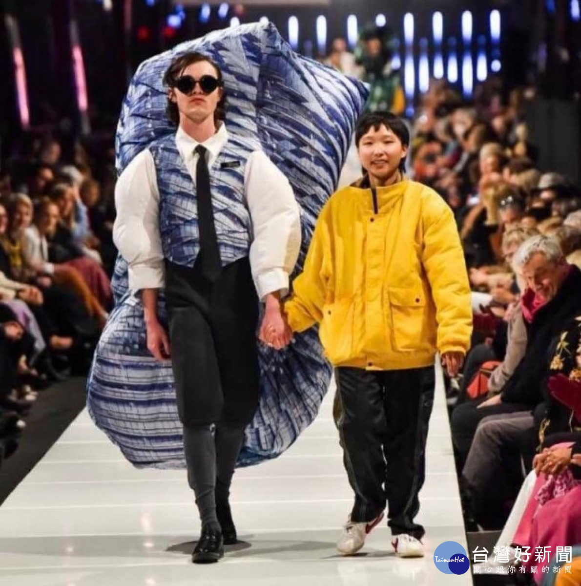 衣啟飛翔創客基地設計師梁宗琳(右)以作品「城市難民Urban Refugees」(左)獲紐西蘭「2023 ID International Emerging Designers Awards國際新銳設計師大獎」冠軍,圖為走秀照片。