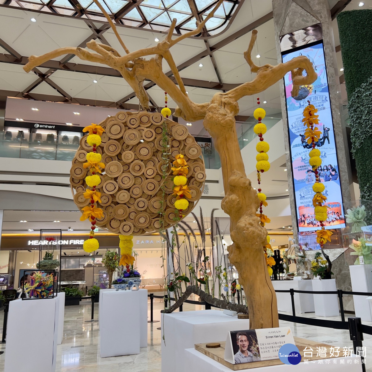 「花漾南紡」花藝展即日起至28日在南紡購物中心A1館1樓時尚廣場盛大展開,本次花展台南市插花協會理事長陳文惠特別與歐洲花藝姊妹協會協調,讓現場得以順利展出比利時花藝名師Sören Van Laer的6件作品。Sören Van Laer為2018年杜拜國際花展、台中世界花藝博覽的金牌得主,並囊括多屆歐洲花藝賽冠軍。