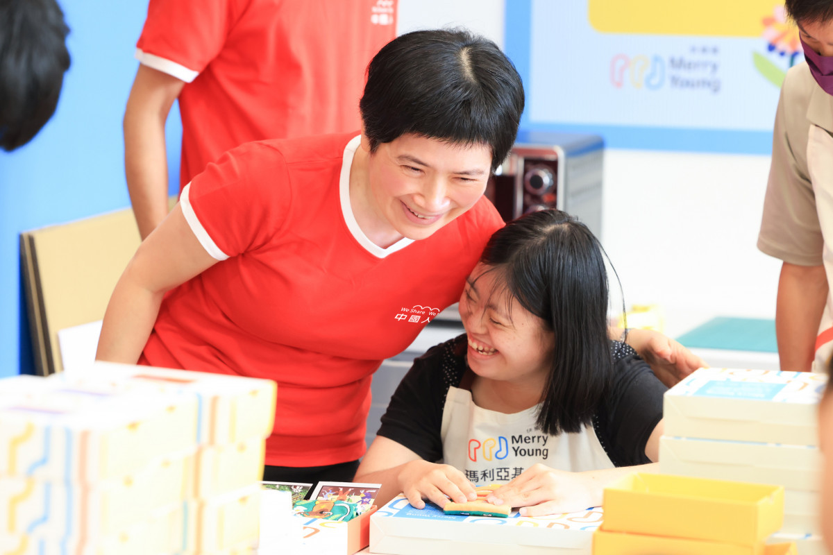 心中有「愛」就無「礙」!中國人壽秉持「愛與關懷」的初心,把對保戶的關懷延伸至社會需要溫暖的角落,用心守護弱勢族群,日前更進一步以具體行動實踐愛的陪練,由中壽黃淑芬總經理率領志工團至瑪利亞社會福利基金會(下稱瑪利亞基金會)台中「瑪利Youngの快樂襪子店」,不僅化身一日實習店長,體驗瑪利亞青年們的日常工作,也將中壽於去年底發起的「一份保單一份愛,傳遞希望分享愛」投保做公益活動所募得的愛心,傳遞給瑪利亞基金會,讓中壽「夥伴型公益」力量成為最幸福的公益心暖流,持續在社會間流動。