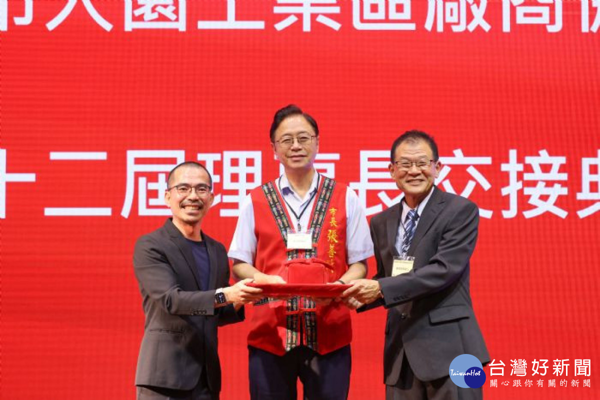 桃園市長張善政1日下午前往大園區,出席「大園工業區廠協會第12屆新卸任理事長交接典禮」。張市長表示,大園工業區廠協會第11屆理事長郭昭志將於今日卸任,其擔任理事長15年內,在工業區推動各項環保措施,可說是勞苦功高,相信接任的第12屆理事長賴銘山也會不負眾望、承接維持環境永續的使命,帶領大園工業區繼續向前,成為台灣的標竿。