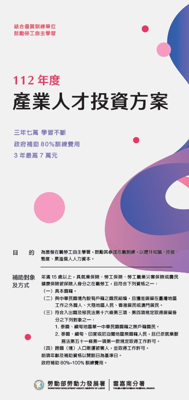 雲嘉南分署長劉邦棟表示,產業瞬息萬變,鼓勵在職勞工不斷投資、精進自己,保持職場競爭力並累進個人的人力資本,勞動部為幫助15歲以上的在職勞工有學習第二專長的機會,推出產投訓練課程,由政府補助8成訓練費用,若符合中高齡、身心障礙等特定對象身分,還可享全額補助,每位勞工每3年可補助7萬元,雲嘉南地區下半年課程也已公告於「在職訓練網」,共計上架532個班次,預計可提供12,108個訓練人次!