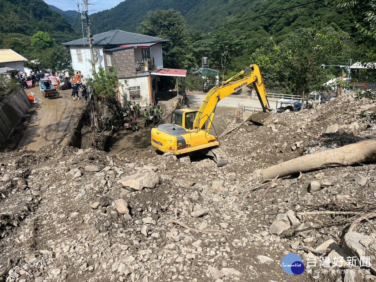 眉溪天主堂路口旁(南豐村教會)最新搶通進度,有機具在清除土石及有國軍人力支援。(圖/南投縣政府提供)