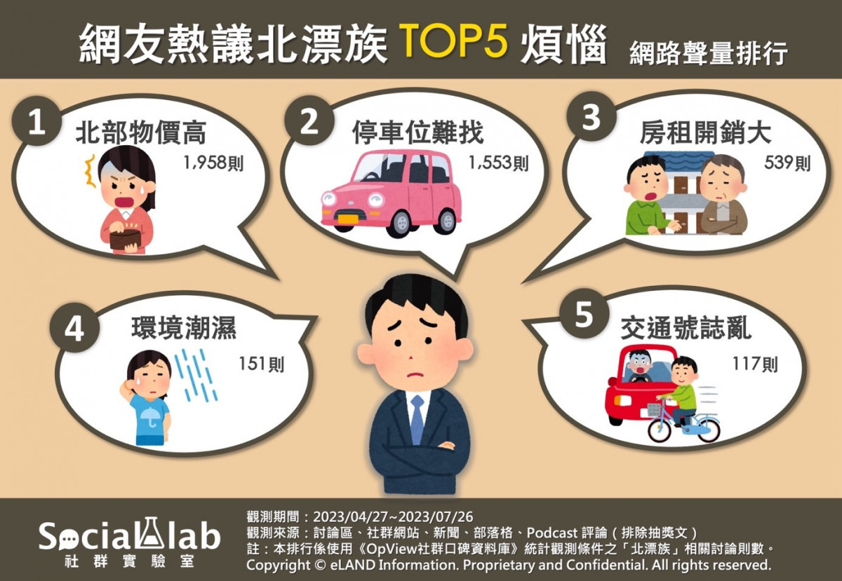觀察三個月內網友針對「北漂族」相關話題的討論,發現「北部物價高」是受到最多人議論的北漂族煩惱。在物價高漲的時代,每隔一段時間物價就會有一波上升潮,而薪水成長幅度卻遠遠跟不上物價飆漲的速度,就有網友點出,特別是北部的物價相對其他縣市又更高更貴,怨道「有時會懷疑自己究竟是在生存or生活」、「想兼顧荷包和生活品質,真的好難好難」,表示在高消費的台北,每月支出相比北漂前會高出許多,除了更難存到錢外,追求良好生活品質的門檻也更高。