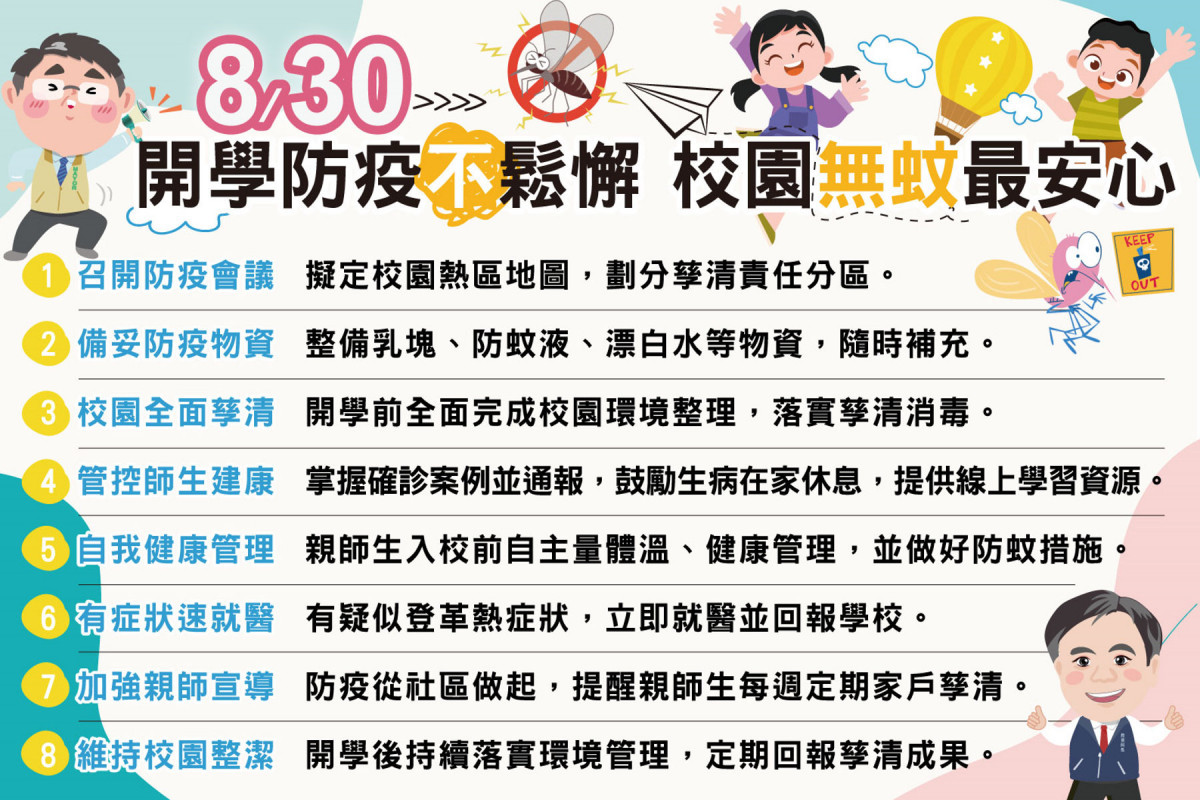 為減少登革熱疫情於開學後造成校園威脅,台南市教育局提出8項開學防疫策略供參考,希望有效提升學校防疫力。教育局表示,已積極督導各校,於開學前動員可用人力,落實巡、倒、清、刷,務必完成校園環境清消、防疫物資整備、落實染疫師生健康關懷等工作。