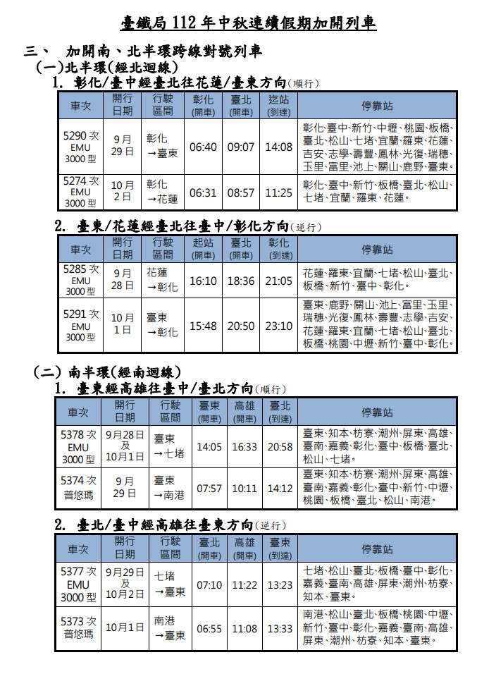 台鐵亦表示,中秋節連假加開東線實名制列車計4列次,於9月1日(周五)0時起,開放2022年8月1日前(配合內政部更新「個人資料取得媒介」政策)設籍於花蓮縣、台東縣之現住人口與國民身分證統一編號第1碼為U或V及上開兩者之配偶與直系血親1親等國民訂票。