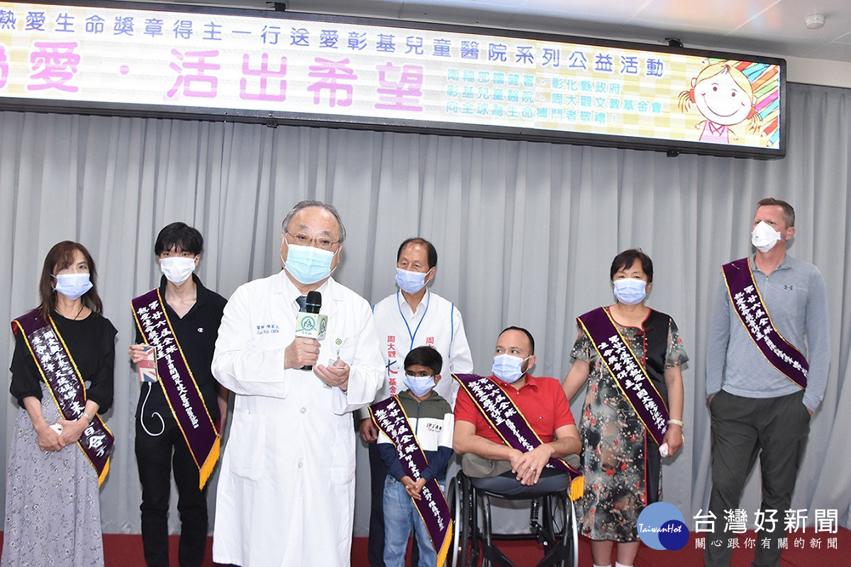 為生命搏鬥者加油打氣,周大觀文教基金會永續送愛彰基兒童醫院會師傳愛,來至全球熱愛生命獎章得主為病友、家屬及醫護人員加油打氣,提倡「和自己好—熱愛自己的生命、和別人好—尊重別人的生命、和地球好—維護地球的的生命。」立委黃秀芳、彰基兒醫院長陳家玉、兒科部部長王士忠醫師,周大觀文教基金會創辦人周進華、董事長郭盈蘭律師,也齊聚為病童加油打氣。