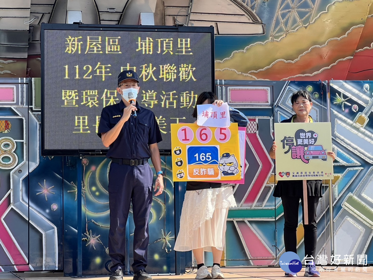 楊梅分局新屋分駐所轄埔頂里29日也在活力健康農場舉辦慶祝中秋節聯歡會有歌唱、摸彩等熱鬧活動,蒞臨現場有主辦的里長李美玉、民代貴賓及里民到場熱情參與。為落實推動社區警政再出發工作,新屋分駐所副所長蔡坤德也率員到場針對里民最關心的轄區治安、交通、打詐、婦幼安全等重點警政工作加強宣導,也提醒鄉親一起防範詐騙,遵守交通規則,關心婦幼安全。