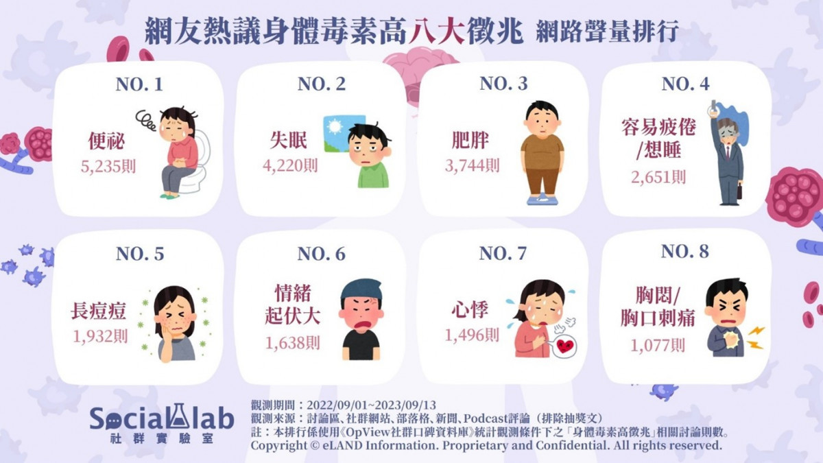 《Social Lab社群實驗室》本次透過《OpView社群口碑資料庫》追蹤近一年內「身體毒素過高徵兆」話題的網路聲量表現,帶您了解網友熱議的體內毒素過高徵兆排行。