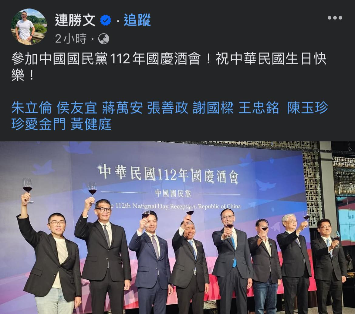 小犬颱風來襲,全台僅北北基桃4縣市沒放颱風假。昨晚颱風夜適逢國民黨國慶酒會,國民黨副主席連勝文在臉書曬出北北基桃首長舉杯喝紅酒照片,引爆網友怒火,有人痛批,「連勝文是豬隊友嗎?」對此,民進黨立委林俊憲在臉書嘆,「勝文啊!你怎麼老是學不會什麼叫「相對剝奪感」?