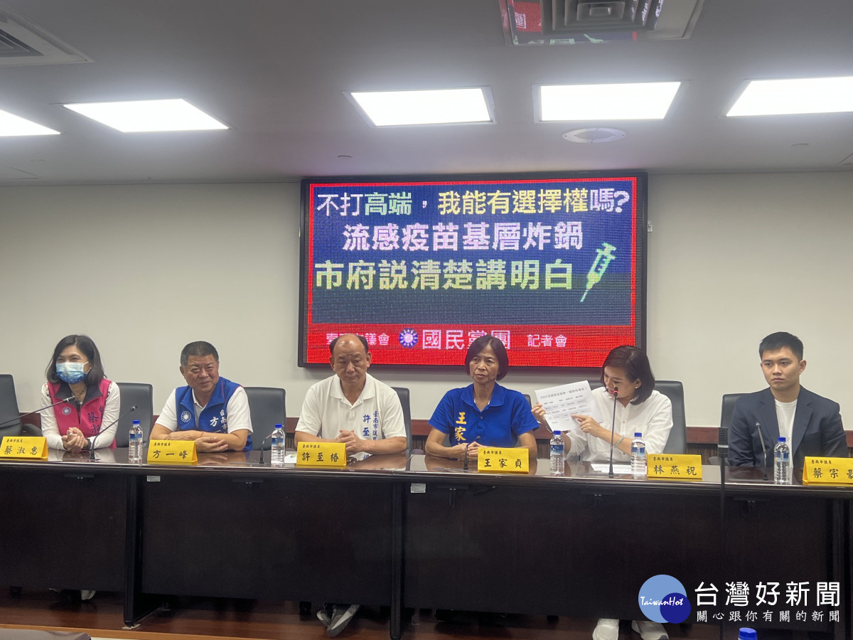 台南開打流感疫苗,市議會國民黨團接獲民怨,6日召開『不打高端,我能有選擇權嗎?流感疫苗基層炸鍋,市府說清楚講明白?』記者會,痛批高端流感疫苗洗產地,多年前從韓國闖關失敗,今年為何能入關?明明告知有四種流感疫苗可施打,可不論學校或各衛生所和診所,都打高端,為怕民眾拒打還『蓋牌』,當天現場才告知打高端,剝奪人民知的權利,讓基層里長背黑鍋,基層都炸鍋。
