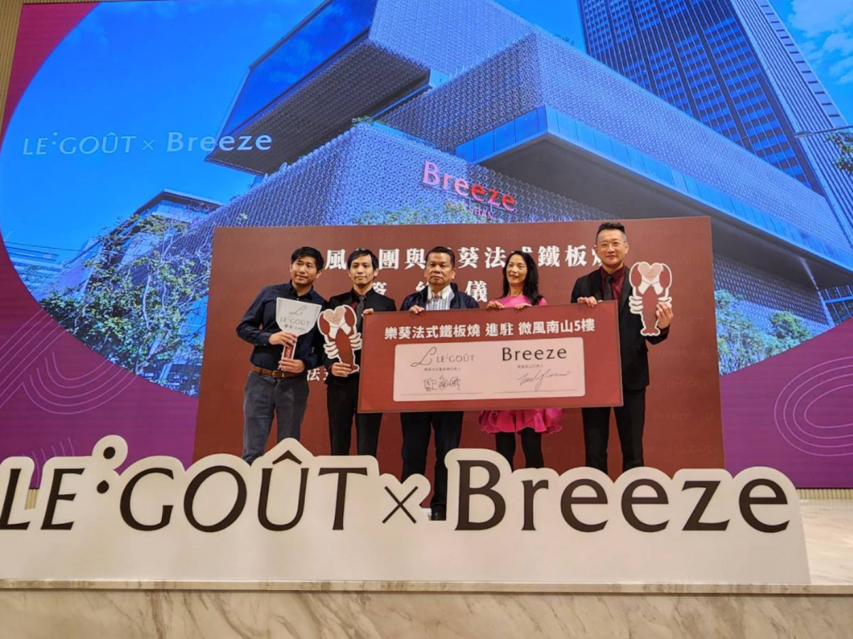 新天地餐飲集團總經理歐敏雄(左3)與微風集團開發招商事業處副總經理高德璇(右2),18日在台中樂葵龍富店會館舉行簽約儀式,高德璇致詞表示,樂葵鐵板燒所用食材頂級,但主打價位高貴不貴,深受台中老饕的喜愛,這回能有合作機會,將有助微風南山館給消費者更多的餐飲服務;歐敏雄則很高興,能將樂葵法式鐵板燒帶到台北,服務更多的客人。