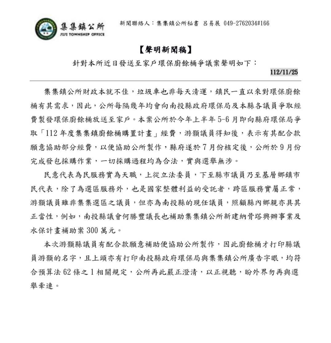 蔡培慧團隊幹部曾琮愷25日,曾至南投地檢署告發國民黨南投縣立委參選人游顥涉賄選,當時蔡培慧競選辦公室指出,接獲民眾通報集集鎮某鄰長逐戶發送廚餘桶時,桶身印著游顥、縣政府、鎮公所聯名贈送,因此曾琮愷並質疑游顥是竹山、鹿谷選區議員,為何跨區請集集鎮公所透過鄰長送價值逾新台幣30元廚餘桶。為此,集集鎮公所25日發布新聞稿表示,鎮民一直對環保廚餘桶有需求,鎮公所每隔幾年向南投縣環保局、各議員爭取經費製發廚餘桶,此案是公所上半年向環保局爭取經費,游顥得知後表示有配合款願意協助部分經費,縣府7月核定、公所9月發包採購,由於游顥有爭取配合款補助,因此桶身才會打印游顥名字,及南投縣政府環保局、集集鎮公所「廣告」,一切過程合法,實在無關選舉。